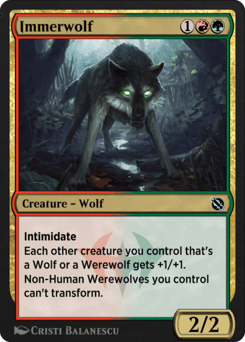 Intimidate (This creature can't be blocked except by artifact creatures and/or creatures that share a color with it.) Each other creature you control that's a Wolf or a Werewolf gets +1/+1. Non-Human Werewolves you control can't transform.