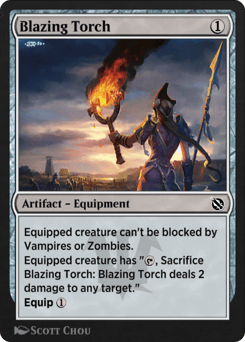 Equipped creature can't be blocked by Vampires or Zombies. Equipped creature has "{T}, Sacrifice Blazing Torch: Blazing Torch deals 2 damage to any target." Equip {1} ({1}: Attach to target creature you control. Equip only as a sorcery.)