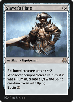 Equipped creature gets +4/+2. Whenever equipped creature dies, if it was a Human, create a 1/1 white Spirit creature token with flying. Equip {3}