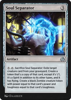 {5}, {T}, Sacrifice this artifact: Exile target creature card from your graveyard. Create a token that's a copy of that card, except it's 1/1, it's a Spirit in addition to its other types, and it has flying. Create a black Zombie creature token with power equal to that card's power and toughness equal to that card's toughness.