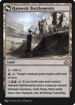 {T}: Add {C}. {R}, {T}: Target creature gains haste until end of turn. {3}{R}{R}, {T}: If you both own and control this land and a creature named Hanweir Garrison, exile them, then meld them into Hanweir, the Writhing Township.