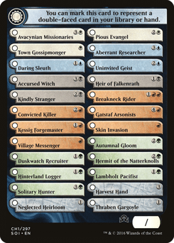 (You can mark this card to represent a double-faced card in your library or hand.) ☐ Avacynian Missionaries {3}{W} ☐ Pious Evangel {2}{W} ☐ Town Gossipmonger {W} ☐ Aberrant Researcher {3}{U} ☐ Daring Sleuth {1}{U} ☐ Uninvited Geist {2}{U} ☐ Accursed Witch {3}{B} ☐ Heir of Falkenrath {1}{B} ☐ Kindly Stranger {2}{B} ☐ Breakneck Rider {1}{R}{R} ☐ Convicted Killer {2}{R} ☐ Gatstaf Arsonists {4}{R} ☐ Kessig Forgemaster {1}{R} ☐ Skin Invasion {1}{R} ☐ Village Messenger {R} ☐ Autumnal Gloom {2}{G} ☐ Duskwatch Recruiter {1}{G} ☐ Hermit of the Natterknolls {2}{G} ☐ Hinterland Logger {1}{G} ☐ Lambholt Pacifist {1}{G} ☐ Solitary Hunter {3}{G} ☐ Harvest Hand {3} ☐ Neglected Heirloom {1} ☐ Thraben Gargoyle {1}