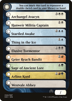 (You can mark this card to represent a double-faced card in your library or hand.) ☐ Archangel Avacyn {3}{W}{W} ☐ Hanweir Militia Captain {1}{W} ☐ Startled Awake {2}{U}{U} ☐ Thing in the Ice {1}{U} ☐ Elusive Tormentor {2}{B}{B} ☐ Geier Reach Bandit {2}{R} ☐ Sage of Ancient Lore {4}{G} ☐ Arlinn Kord {2}{R}{G} ☐ Westvale Abbey
