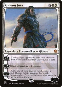 [+2]: During target opponent's next turn, creatures that player controls attack Gideon Jura if able. [−2]: Destroy target tapped creature. [0]: Until end of turn, Gideon Jura becomes a 6/6 Human Soldier creature that's still a planeswalker. Prevent all damage that would be dealt to him this turn.