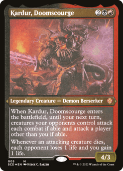 When Kardur enters, until your next turn, creatures your opponents control attack each combat if able and attack a player other than you if able. Whenever an attacking creature dies, each opponent loses 1 life and you gain 1 life.