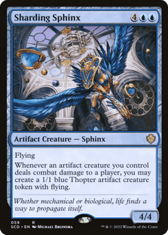 Flying Whenever an artifact creature you control deals combat damage to a player, you may create a 1/1 blue Thopter artifact creature token with flying.
