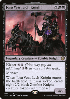 Kicker {5}{B} (You may pay an additional {5}{B} as you cast this spell.) Menace When Josu Vess enters, if it was kicked, create eight 2/2 black Zombie Knight creature tokens with menace.