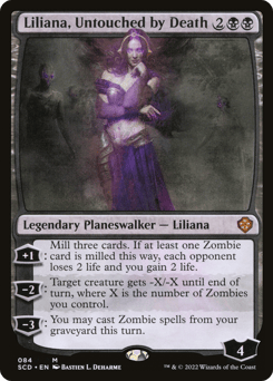[+1]: Mill three cards. If at least one Zombie card is milled this way, each opponent loses 2 life and you gain 2 life. [−2]: Target creature gets -X/-X until end of turn, where X is the number of Zombies you control. [−3]: You may cast Zombie spells from your graveyard this turn.