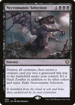 Destroy all creatures, then return a creature card put into a graveyard this way to the battlefield under your control. It's a black Zombie in addition to its other colors and types. Exile Necromantic Selection.