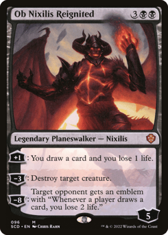 [+1]: You draw a card and you lose 1 life. [−3]: Destroy target creature. [−8]: Target opponent gets an emblem with "Whenever a player draws a card, you lose 2 life."