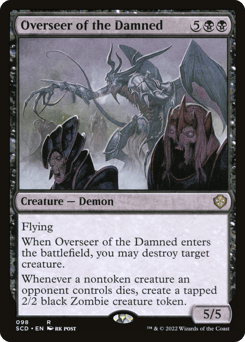 Flying When this creature enters, you may destroy target creature. Whenever a nontoken creature an opponent controls dies, create a tapped 2/2 black Zombie creature token.