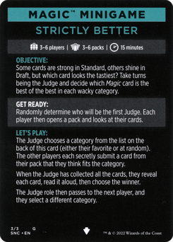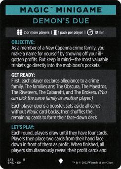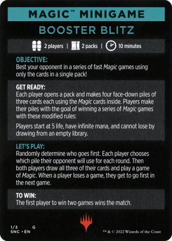 2 players | 2 packs | 10 minutes OBJECTIVE: Best your opponent in a series of fast Magic games using only the cards in a single pack! GET READY: Each player opens a pack and makes four face-down piles of three cards each using the Magic cards inside. Players make their piles with the goal of winning a series of Magic games with these modified rules: Players start at 5 life, have infinite mana, and cannot lose by drawing from an empty library. LET'S PLAY: Randomly determine who goes first. Each player chooses which pile their opponent will use for each round. Then both players draw all three of their cards and play a game of Magic. When a player loses a game, they get to go first in the next game. TO WIN: The first player to win two games wins the match.