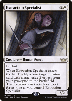 Lifelink When this creature enters, return target creature card with mana value 2 or less from your graveyard to the battlefield. That creature can't attack or block for as long as you control this creature.