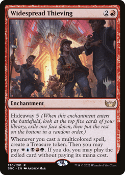 Hideaway 5 (When this enchantment enters, look at the top five cards of your library, exile one face down, then put the rest on the bottom in a random order.) Whenever you cast a multicolored spell, create a Treasure token. Then you may pay {W}{U}{B}{R}{G}. If you do, you may play the exiled card without paying its mana cost.