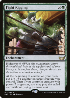 Hideaway 5 (When this enchantment enters, look at the top five cards of your library, exile one face down, then put the rest on the bottom in a random order.) At the beginning of combat on your turn, put a +1/+1 counter on target creature you control. Then if you control a creature with power 7 or greater, you may play the exiled card without paying its mana cost.
