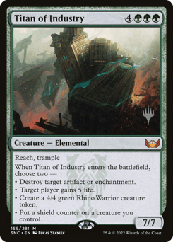Reach, trample When this creature enters, choose two — • Destroy target artifact or enchantment. • Target player gains 5 life. • Create a 4/4 green Rhino Warrior creature token. • Put a shield counter on a creature you control.