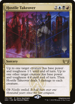 Up to one target creature has base power and toughness 1/1 until end of turn. Up to one other target creature has base power and toughness 4/4 until end of turn. Then Hostile Takeover deals 3 damage to each creature.