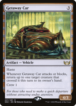 Haste Whenever this Vehicle attacks or blocks, return up to one target creature that crewed it this turn to its owner's hand. Crew 1