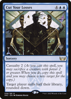 Casualty 2 (As you cast this spell, you may sacrifice a creature with power 2 or greater. When you do, copy this spell and you may choose a new target for the copy.) Target player mills half their library, rounded down.