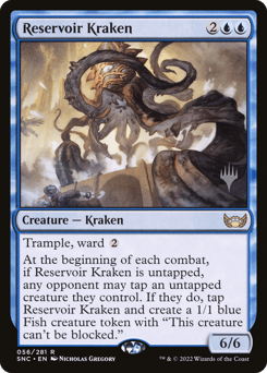 Trample, ward {2} At the beginning of each combat, if this creature is untapped, any opponent may tap an untapped creature they control. If they do, tap this creature and create a 1/1 blue Fish creature token with "This token can't be blocked."