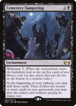 Hideaway 5 (When this enchantment enters, look at the top five cards of your library, exile one face down, then put the rest on the bottom in a random order.) At the beginning of your upkeep, you may mill three cards. Then if there are twenty or more cards in your graveyard, you may play the exiled card without paying its mana cost.