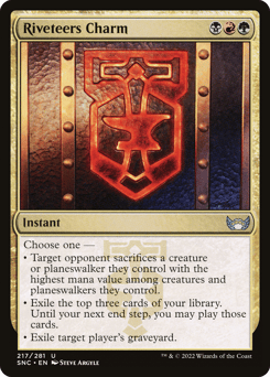Choose one — • Target opponent sacrifices a creature or planeswalker they control with the greatest mana value among creatures and planeswalkers they control. • Exile the top three cards of your library. Until your next end step, you may play those cards. • Exile target player's graveyard.