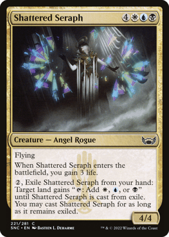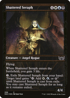 Flying When Shattered Seraph enters, you gain 3 life. {1}, Exile Shattered Seraph from your hand: Target land gains "{T}: Add {W}, {U}, or {B}" until Shattered Seraph is cast from exile. You may cast Shattered Seraph for as long as it remains exiled.