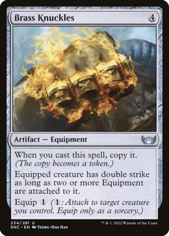 When you cast this spell, copy it. (The copy becomes a token.) Equipped creature has double strike as long as two or more Equipment are attached to it. Equip {1} ({1}: Attach to target creature you control. Equip only as a sorcery.)