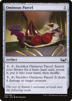 {1}, {T}, Sacrifice Ominous Parcel: Search your library for a basic land card, reveal it, put it into your hand, then shuffle. {5}, {T}, Sacrifice Ominous Parcel: It deals 4 damage to target creature.
