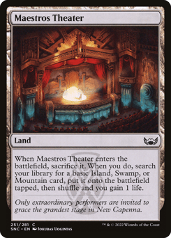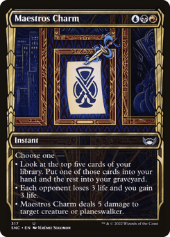Choose one — • Look at the top five cards of your library. Put one of those cards into your hand and the rest into your graveyard. • Each opponent loses 3 life and you gain 3 life. • Maestros Charm deals 5 damage to target creature or planeswalker.