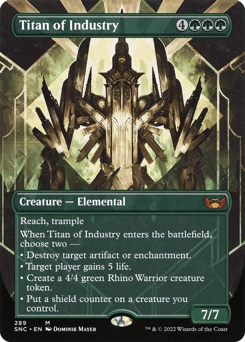 Reach, trample When this creature enters, choose two — • Destroy target artifact or enchantment. • Target player gains 5 life. • Create a 4/4 green Rhino Warrior creature token. • Put a shield counter on a creature you control.