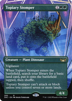 Vigilance (Attacking doesn't cause this creature to tap.) When this creature enters, search your library for a basic land card, put it onto the battlefield tapped, then shuffle. This creature can't attack or block unless you control seven or more lands.