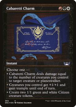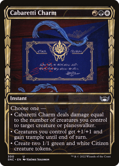 Choose one — • Cabaretti Charm deals damage equal to the number of creatures you control to target creature or planeswalker. • Creatures you control get +1/+1 and gain trample until end of turn. • Create two 1/1 green and white Citizen creature tokens.