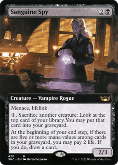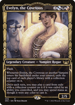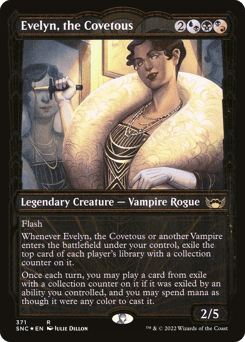 Flash Whenever Evelyn or another Vampire you control enters, exile the top card of each player's library with a collection counter on it. Once each turn, you may play a card from exile with a collection counter on it if it was exiled by an ability you controlled, and you may spend mana as though it were mana of any color to cast it.