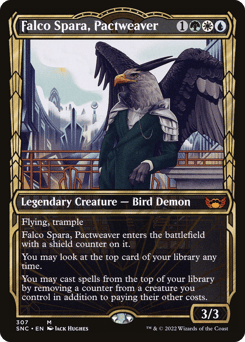 Flying, trample Falco Spara enters with a shield counter on it. You may look at the top card of your library any time. You may cast spells from the top of your library by removing a counter from a creature you control in addition to paying their other costs.