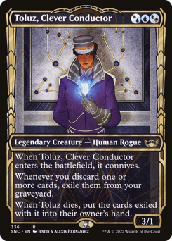 When Toluz enters, it connives. (Draw a card, then discard a card. If you discarded a nonland card, put a +1/+1 counter on this creature.) Whenever you discard one or more cards, exile them from your graveyard. When Toluz dies, put the cards exiled with it into their owner's hand.