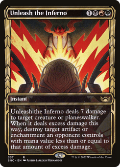Unleash the Inferno deals 7 damage to target creature or planeswalker. When it deals excess damage this way, destroy target artifact or enchantment an opponent controls with mana value less than or equal to that amount of excess damage.