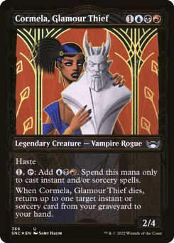 Haste {1}, {T}: Add {U}{B}{R}. Spend this mana only to cast instant and/or sorcery spells. When Cormela dies, return up to one target instant or sorcery card from your graveyard to your hand.