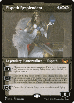 [+1]: Choose up to one target creature. Put a +1/+1 counter and a counter from among flying, first strike, lifelink, or vigilance on it. [−3]: Look at the top seven cards of your library. You may put a permanent card with mana value 3 or less from among them onto the battlefield with a shield counter on it. Put the rest on the bottom of your library in a random order. [−7]: Create five 3/3 white Angel creature tokens with flying.