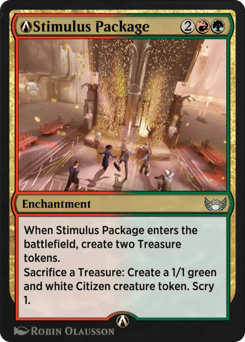 When Stimulus Package enters, create two Treasure tokens. (They're artifacts with "{T}, Sacrifice this artifact: Add one mana of any color.") Sacrifice a Treasure: Create a 1/1 green and white Citizen creature token. Scry 1.