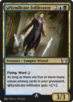 Flying, ward {2} As long as there are five or more mana values among cards in your graveyard, Syndicate Infiltrator gets +2/+2.