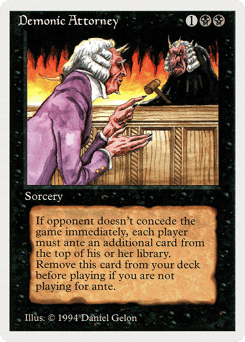 Remove Demonic Attorney from your deck before playing if you're not playing for ante. Each player antes the top card of their library.