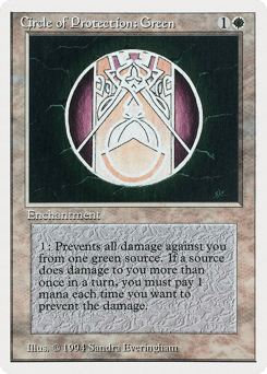 Enchant creature Enchanted creature has protection from green. This effect doesn't remove this Aura.