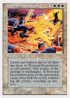 {0}: The next 1 damage that would be dealt to this creature this turn is dealt to its owner instead. Only this creature's owner may activate this ability. When this creature dies, its owner loses half their life, rounded up.