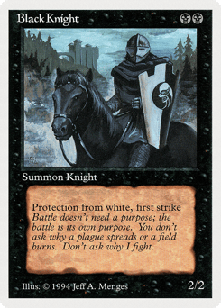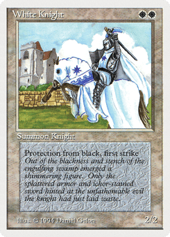 First strike (This creature deals combat damage before creatures without first strike.) Protection from black (This creature can't be blocked, targeted, dealt damage, or enchanted by anything black.)