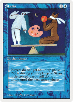 Players skip their untap steps. At the beginning of your upkeep, sacrifice this enchantment unless you pay {U}.