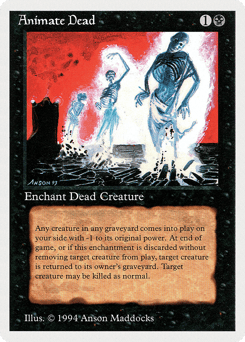 Enchant creature card in a graveyard When this Aura enters, if it's on the battlefield, it loses "enchant creature card in a graveyard" and gains "enchant creature put onto the battlefield with this Aura." Return enchanted creature card to the battlefield under your control and attach this Aura to it. When this Aura leaves the battlefield, that creature's controller sacrifices it. Enchanted creature gets -1/-0.