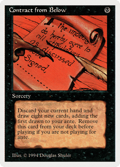 Remove Contract from Below from your deck before playing if you're not playing for ante. Discard your hand, ante the top card of your library, then draw seven cards.