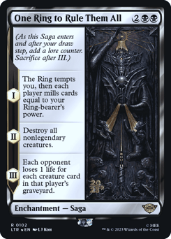 (As this Saga enters and after your draw step, add a lore counter. Sacrifice after III.) I — The Ring tempts you, then each player mills cards equal to your Ring-bearer's power. II — Destroy all nonlegendary creatures. III — Each opponent loses 1 life for each creature card in that player's graveyard.