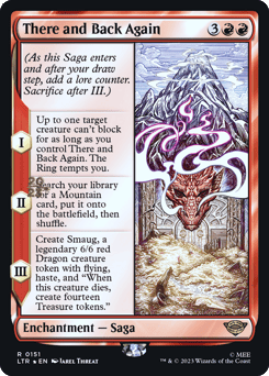 (As this Saga enters and after your draw step, add a lore counter. Sacrifice after III.) I — Up to one target creature can't block for as long as you control this Saga. The Ring tempts you. II — Search your library for a Mountain card, put it onto the battlefield, then shuffle. III — Create Smaug, a legendary 6/6 red Dragon creature token with flying, haste, and "When Smaug dies, create fourteen Treasure tokens."